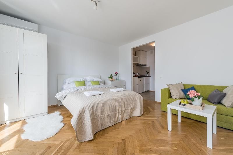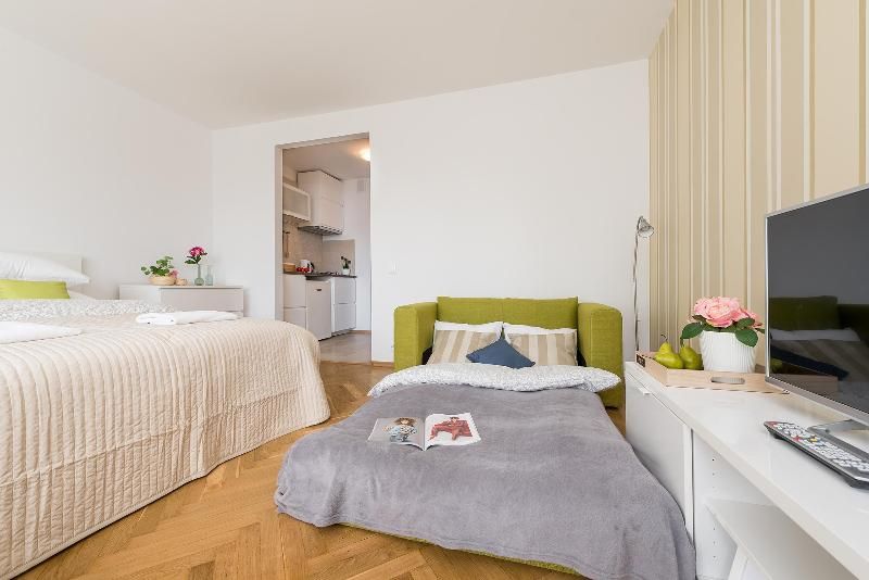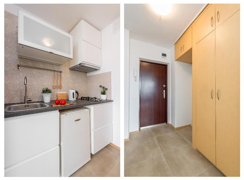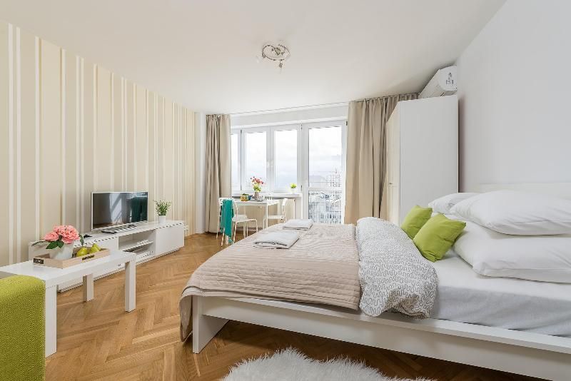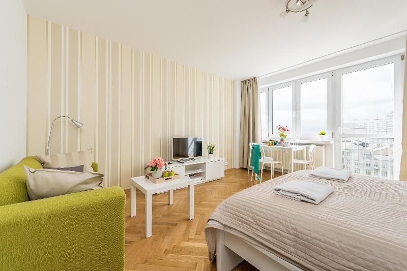 Cozy studio apartment with air conditioning located on the 8th floor of the Ryłko building right next to Rondo ONZ Metro Station. Convenient location allows easy access to all important points of the City, including Old Town, Zlote Tarasy shopping mall and Warszawa Centralna Railway Station. The studio is equipped with a comfortable double bed and a sofa bed for 1 person or 2 children. There are closets in the room and in the hallway, as well as a chest of drawers that allow you to unpack all of your personal items. The apartment has a small kitchenette equipped with a refrigerator, a 2-burner gas hob and a sink.